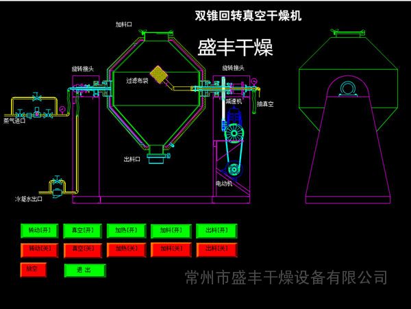 双锥回转真空干燥机为双锥形的回转罐体,罐内在真空状态下,燥机作为向夹套内通入蒸汽或热水进行加热,热量通过罐体内壁与湿物料接触,湿物料吸热后蒸发的水汽,通过真空泵经真空排气管被抽 走。由于罐体内处于真空状态,且罐体的回转使物料不断的上下内外翻动,故加快了物料的干燥速度,提高干燥效率,达到均匀干燥的目的。